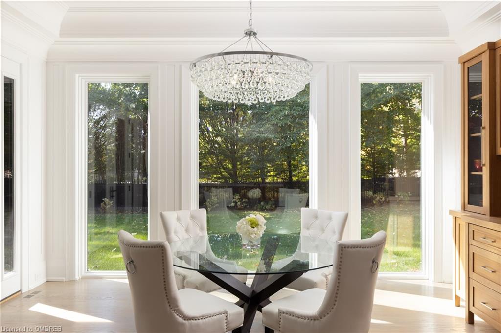 Discover luxury living in this exquisite custom-built West Coast-style home, nestled on a prestigious street in Southeast Oakville. This opulent residence boasts an impressive 5,484 square foot above grade, with over 9,000 square feet of finished living space, perfect for both family life and entertaining. Step inside to find a thoughtfully designed floor plan featuring 10 foot ceilings on the main level and 9 foot ceilings on the upper and lower levels. The main floor showcases a separate living room, formal dining room, and home office with built-in cabinetry. The heart of the home is the great room, complete with a fireplace flanked by custom built-ins, seamlessly flowing into the gourmet kitchen & breakfast area. Culinary enthusiasts will appreciate the servery with a walk-in pantry, while French doors lead to a covered terrace with an outdoor fireplace perfect for al fresco dining and relaxation. An oversized mudroom with built-ins and a three-piece bath adds convenience, while the three-car garage (double with tandem) provides ample storage. Ascend to the upper level, where you'll find the primary bedroom suite, a true sanctuary with a double-sided fireplace serving both the bedroom and ensuite. The spa-like bathroom features a freestanding tub and a large island. Four additional bedrooms, each with their own ensuite, ensure privacy and comfort for family and guests alike. The lower level extends the living and entertaining space with a rec room, wine room, wet bar, home theatre, and two additional bedrooms with ensuites. Outside, the expansive rear yard is adorned with perennials and mature trees, creating a private oasis. Located just steps from Lakeshore Road, walking paths, and downtown Oakville, this home offers the perfect blend of luxury and convenience. With easy access to the GO train and major highways, it's ideal for commuters. Experience the epitome of opulent living in this remarkable residence that seamlessly combines everyday family comfort with exceptional entertaining spaces.