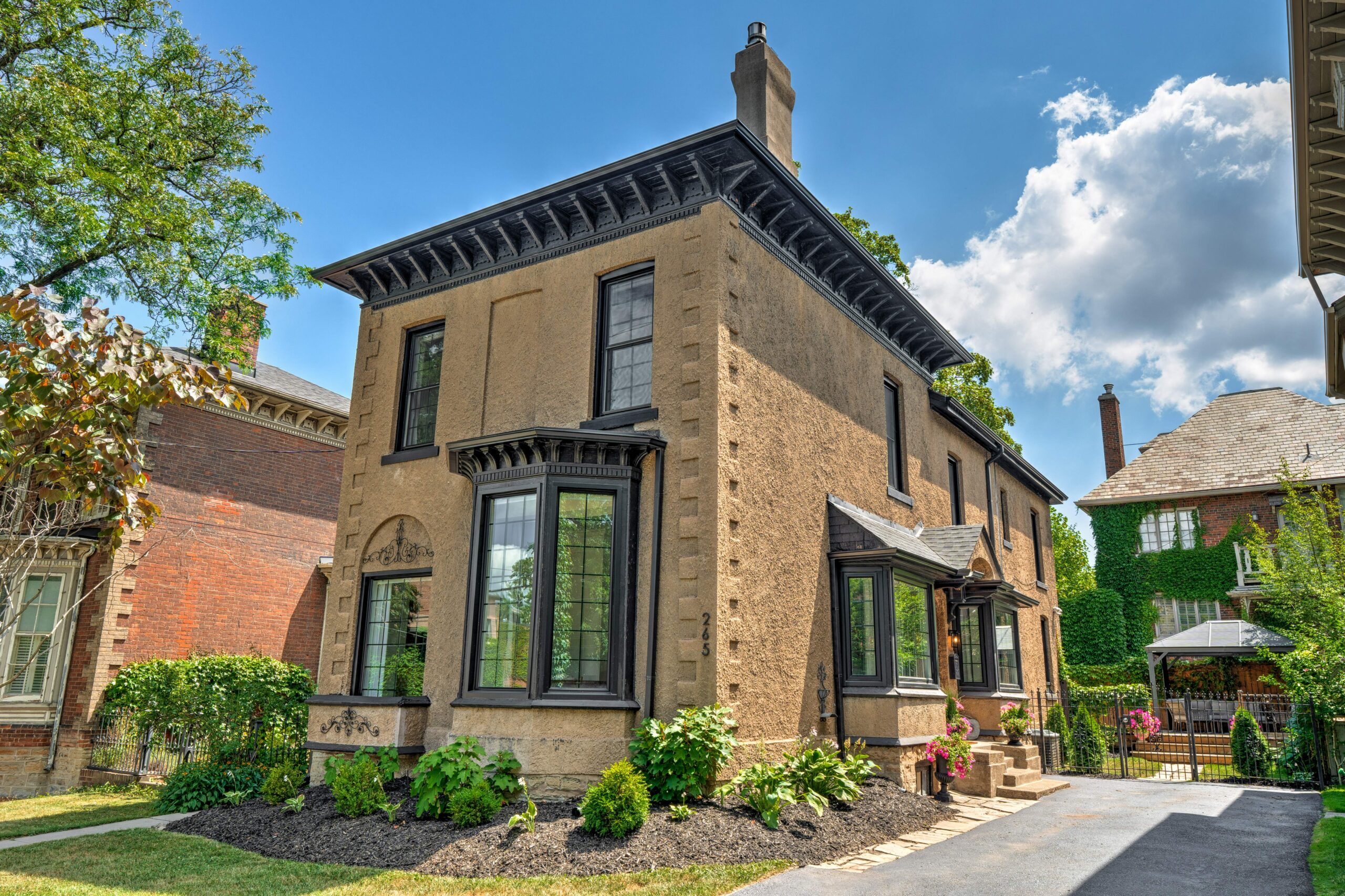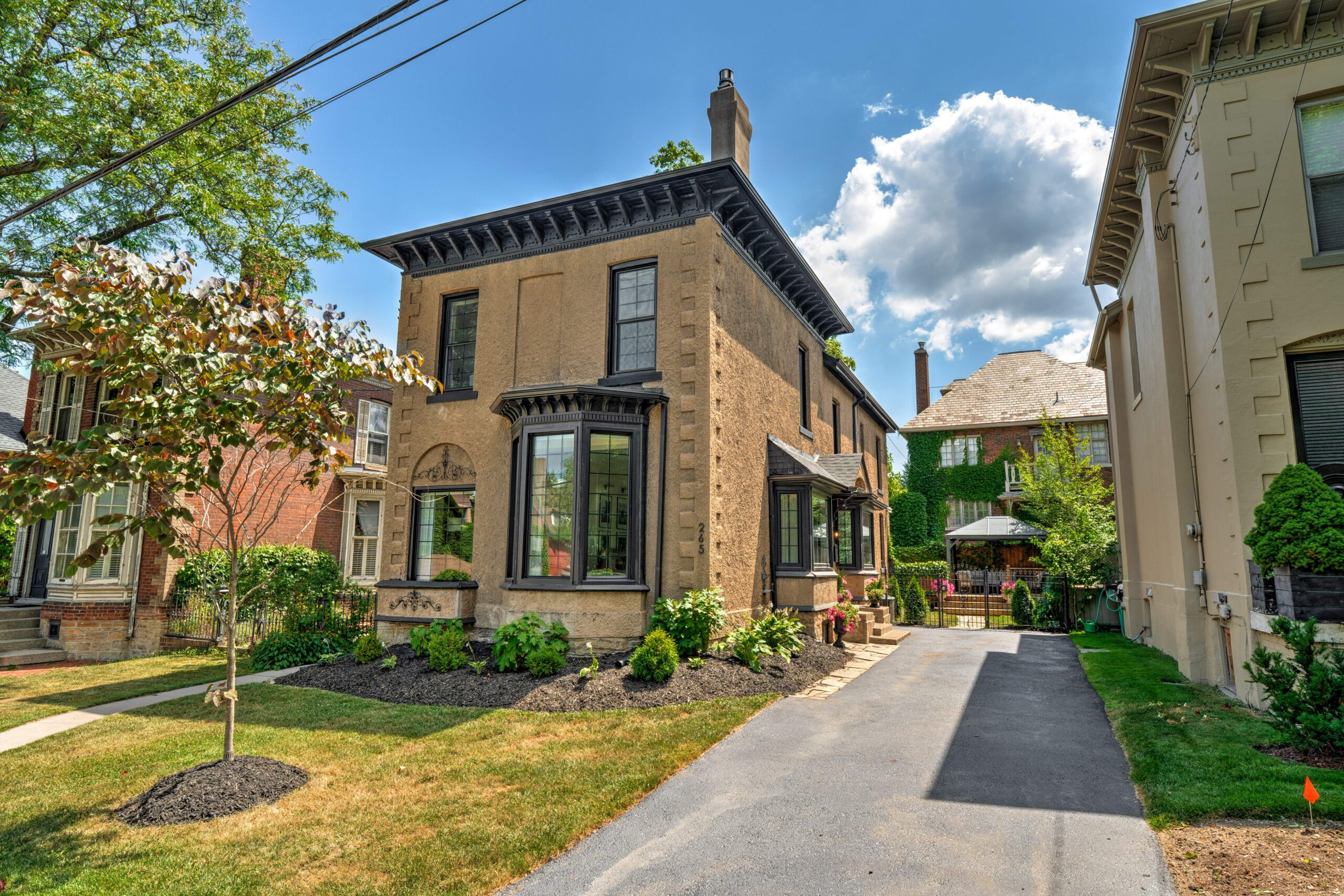 Discover timeless elegance and modern luxury in this exquisitely restored 1867 Victorian. Nestled in the heart of the vibrant Durand neighbourhood, this 4-bedroom, 3-bathroom masterpiece spans nearly 2200 square feet across two stories, where original grandeur-highlighted by the arched solid wood front door, curved ceilings in the foyer, soaring 10-foot ceilings, and oversized bay windows-merges seamlessly with premium contemporary finishes. The main floor flows effortlessly through a formal living room with custom mouldings, an original marble mantle and complimentary gas log set, elegant dining area, a gourmet chef's kitchen showcasing full-height white oak and crisp white cabinetry to the ceiling, gleaming quartz counters, and built-in full sized fridge and freezer. A designer 2-piece bath and a custom mudroom with built-in storage complete the main floor. Upstairs, the serene primary suite features floor-to-ceiling closets, a spa-like ensuite with a frameless glass walk-in rain shower, joined by three additional bedrooms, an additional 5-piece bathroom, second-floor laundry, and a sun-drenched sunroom with wrap-around windows-perfect as a cozy den. Outside, a fully fenced backyard becomes a lush, private retreat surrounded by summer grapevines. Parking for three cars and equipped with an EV charger. Meticulously maintained and upgraded with new shingles (2025), windows (2022), boiler and radiators (2023), and AC (2021), this home blends heritage charm with turnkey sophistication.