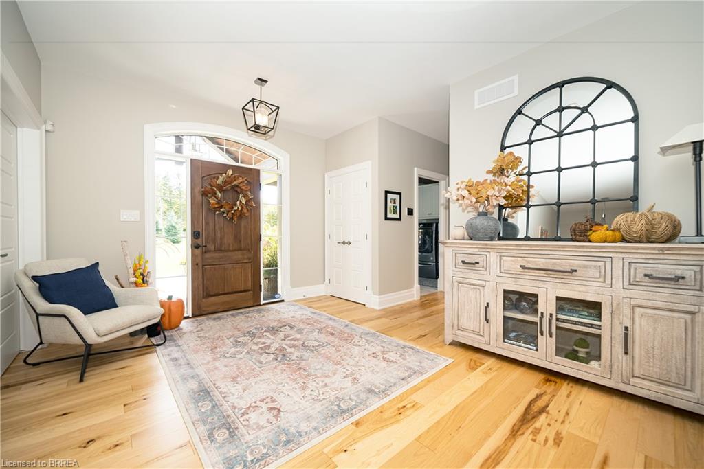 An extraordinary custom-built bungalow set on a beautifully landscaped 1.52-acre lot in St. George. This luxurious property offers over 5,000 square feet of finished living space including a compete 3 bedroom inlaw suite with private walk out, egress windows throughout. The main floor features 2 bedrooms, an office and 2.5 bathrooms, highlighted by a stunning great room with 13.5 foot vaulted ceilings lined with hand-milled pine beams and 5" Hickory scraped floors through primary living spaces. The custom kitchen includes a 7 foot Cambria quartz island, JennAir stainless steel appliances and a pot filler over the 36" induction range, with a walk-in pantry. A two-sided stone fireplace connects the dining room to the covered patio. The breakfast area opens to fully enclosed 3 season patio off the breakfast area, equipped with retractable screens and a mounted TV. The primary bedroom features 2 walk-in closets and a 4pc ensuite with double sinks and an 8 foot glass-enclosed curbless rain shower. The second main floor bedroom also has its own private ensuite. The main floor is complete with a laundry room and a mudroom with direct access to an oversized 2-car garage. The lower level offers 3 bedrooms, 2 full baths, a chefs kitchen with a 10 foot Cambria quartz island and a media room with a custom built-in linear fireplace. Additional amenities include a home gym, a laundry area and radiant in-floor heating throughout. Outdoors, enjoy the dual Napoleon grills in the fully equipped outdoor kitchen, perfect for entertaining beneath the 16ft retractable awning. This home also boasts geothermal heating & cooling and a detached propane-heated garage at the back of the property. With extensive interlock pathways, custom firepits, and Lutron Bluetooth-controlled lighting throughout, Generac whole home generator, this property is the epitome of refined country living, minutes from highways, schools & amenities. Full property feature list available upon request.