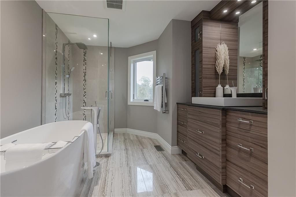 The upper level consists of a master retreat with a brand new most exquisite ensuite, his and her closets and electric fireplace, three additional bedrooms and spa-like 5 piece bathroom with heated towel bars. In the lower level you will find a large fitness room, additional guest bedroom, lovely rec room with gas fireplace, a wine room and 3 piece bathroom. An incredible backyard resort featuring a tennis court, inviting gunite pool, a beautiful pavilion with hot tub and gas fireplace complete this rare offering. Let's get you home!